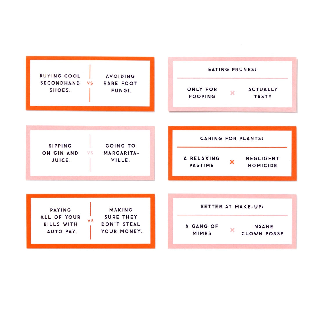 For example: Those brownie edge pieces are garbage. Go ahead, prove us wrong. - Includes 200 things to argue about...not like you needed the help, dad. - Are hot dogs sandwiches? Is cereal a soup? Pick a side, then pick a fight.