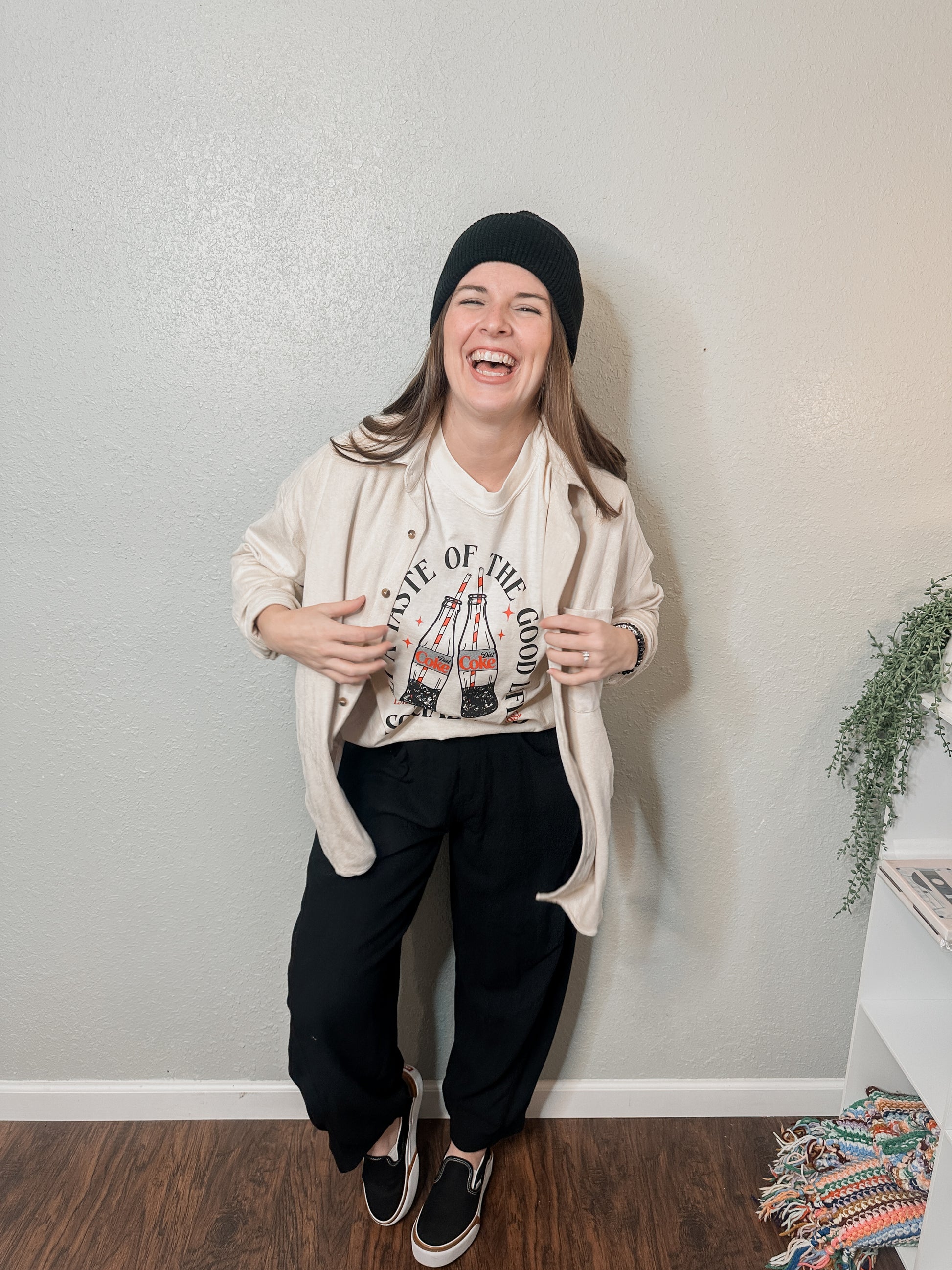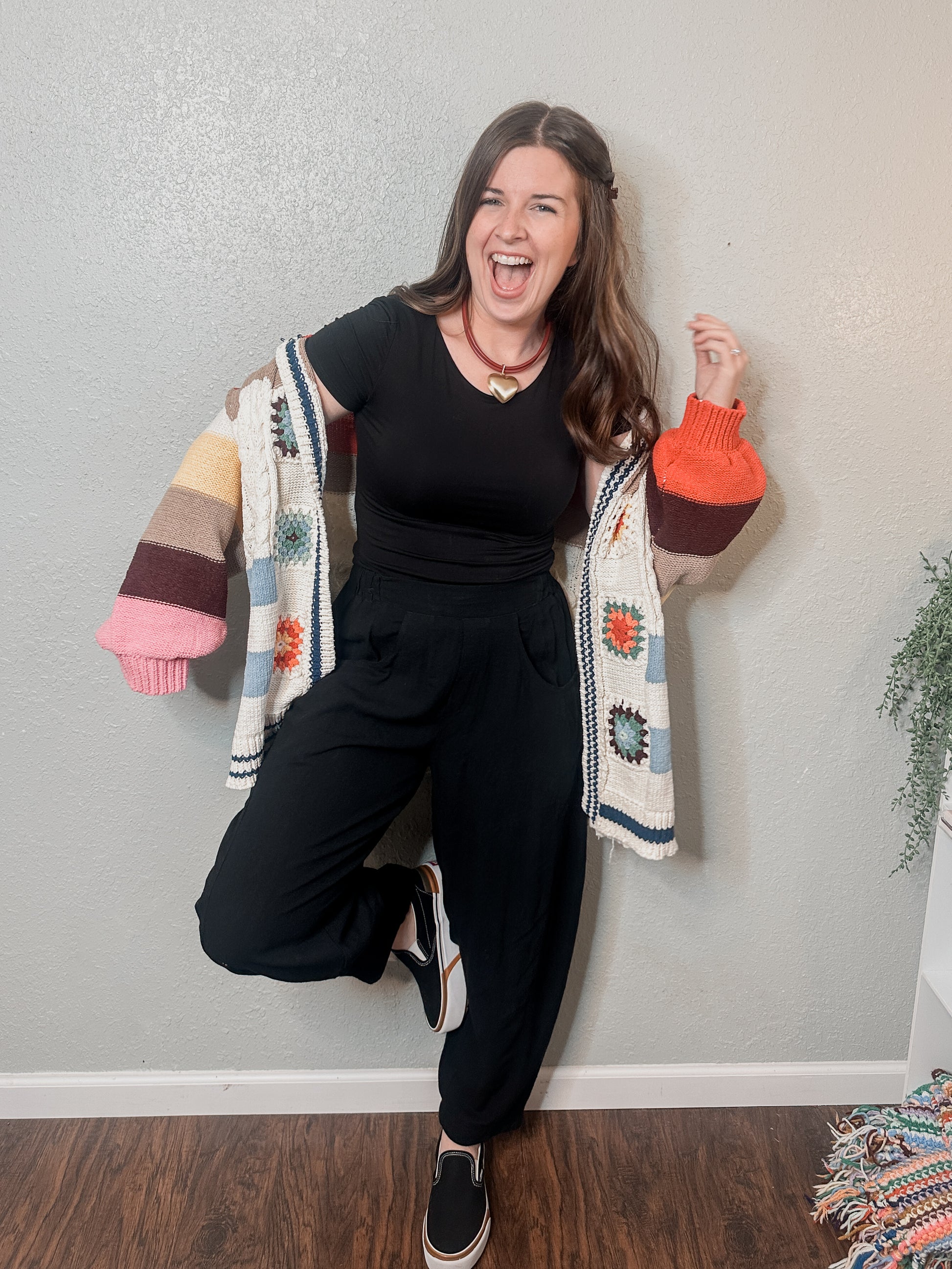 True to size. Kelli is in the small. Stretchy waistband. Perfect for post partum or that second trimester where nothing starts to fit anymore. Maybe you are like Kelli and wanted some comfy lightweight pants for summer. These are sooo good!