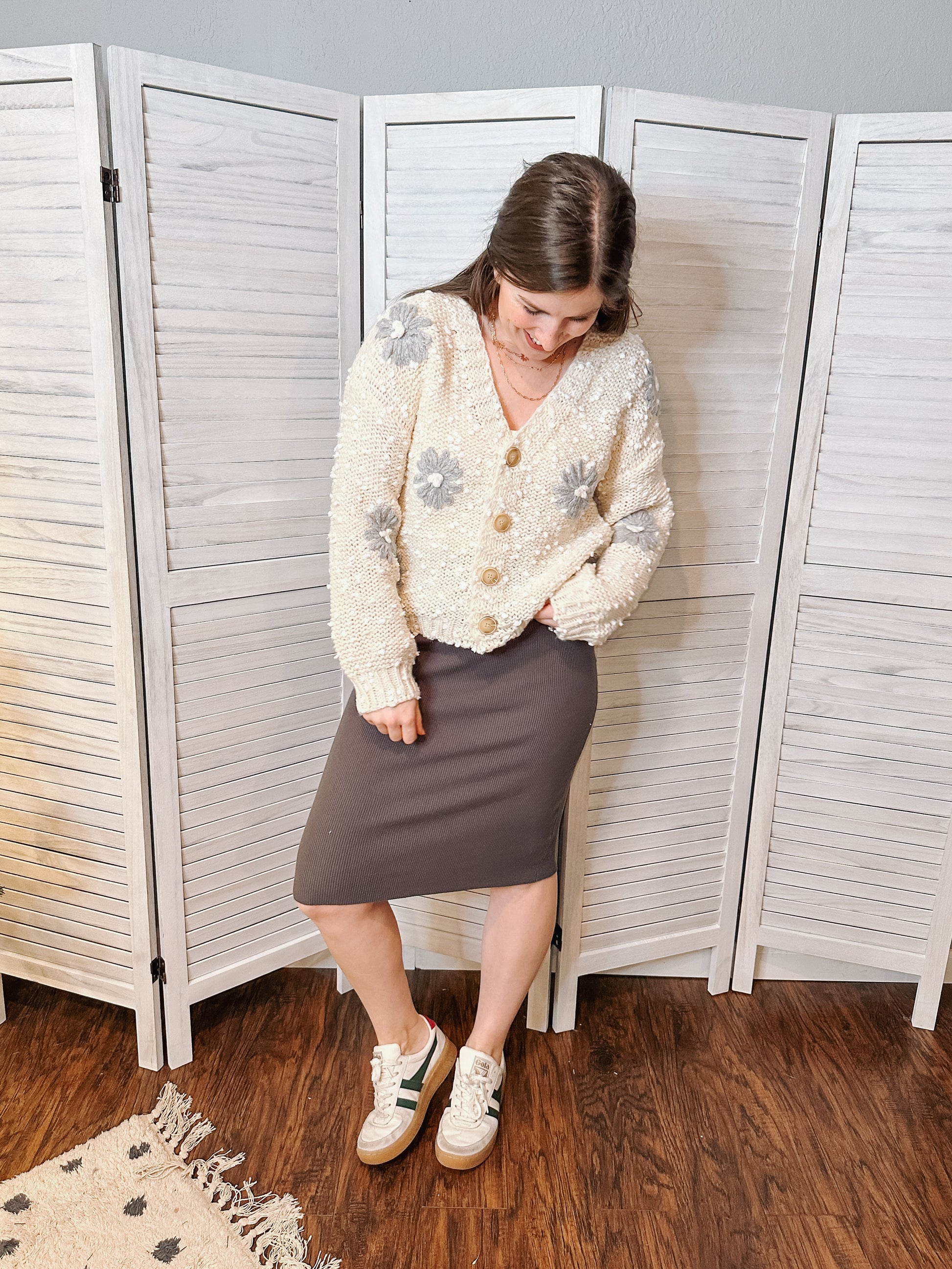 Bump friendly skirt of your dreams! Seriously, this one is so soft and stretchy! Third trimester mamas, bump up one from your normal size. Otherwise, the rest of ya, stay true to size. Kelli is in the size small. Pair with a tied up graphic tee or layer your fav sweater over!
