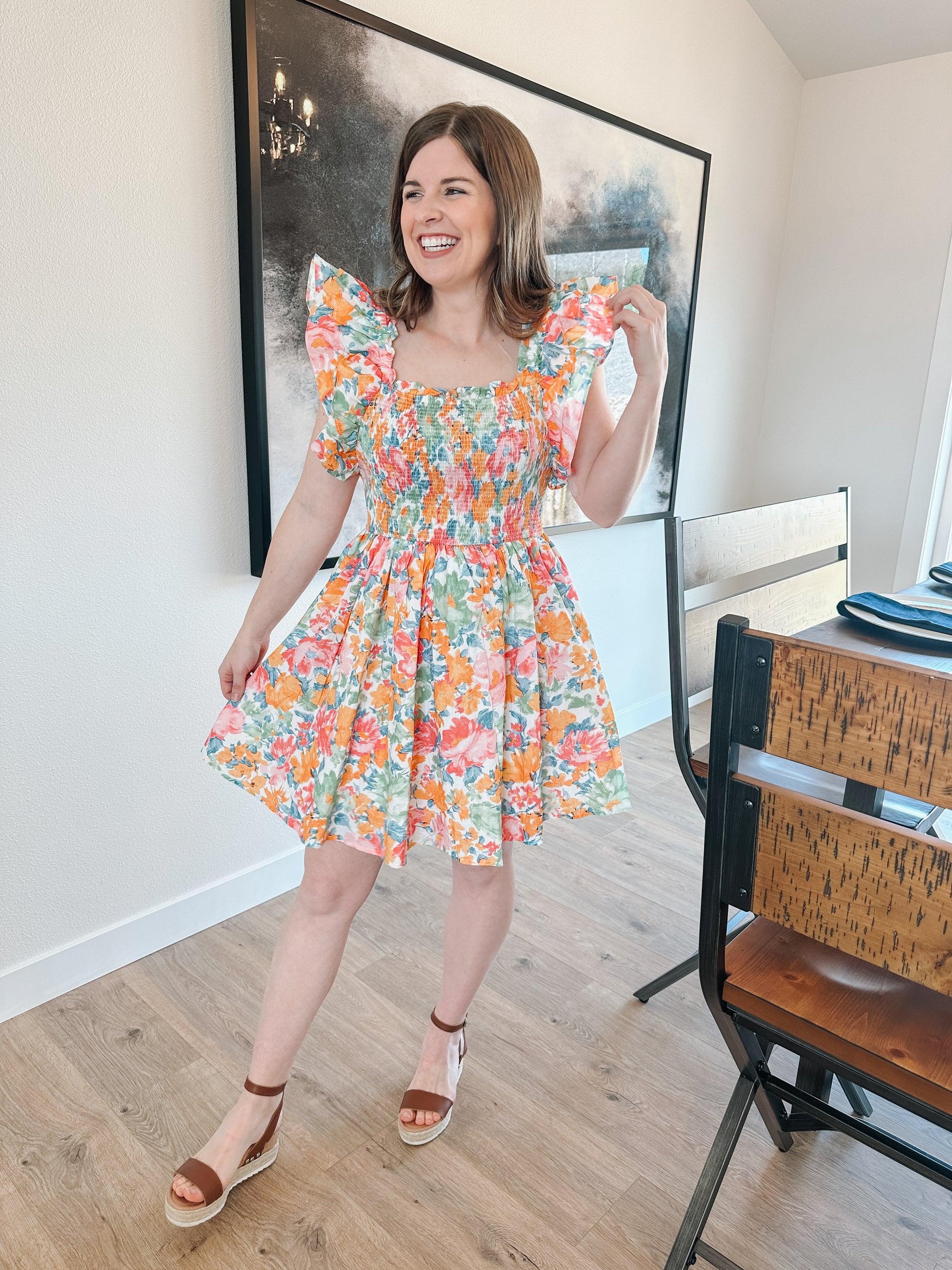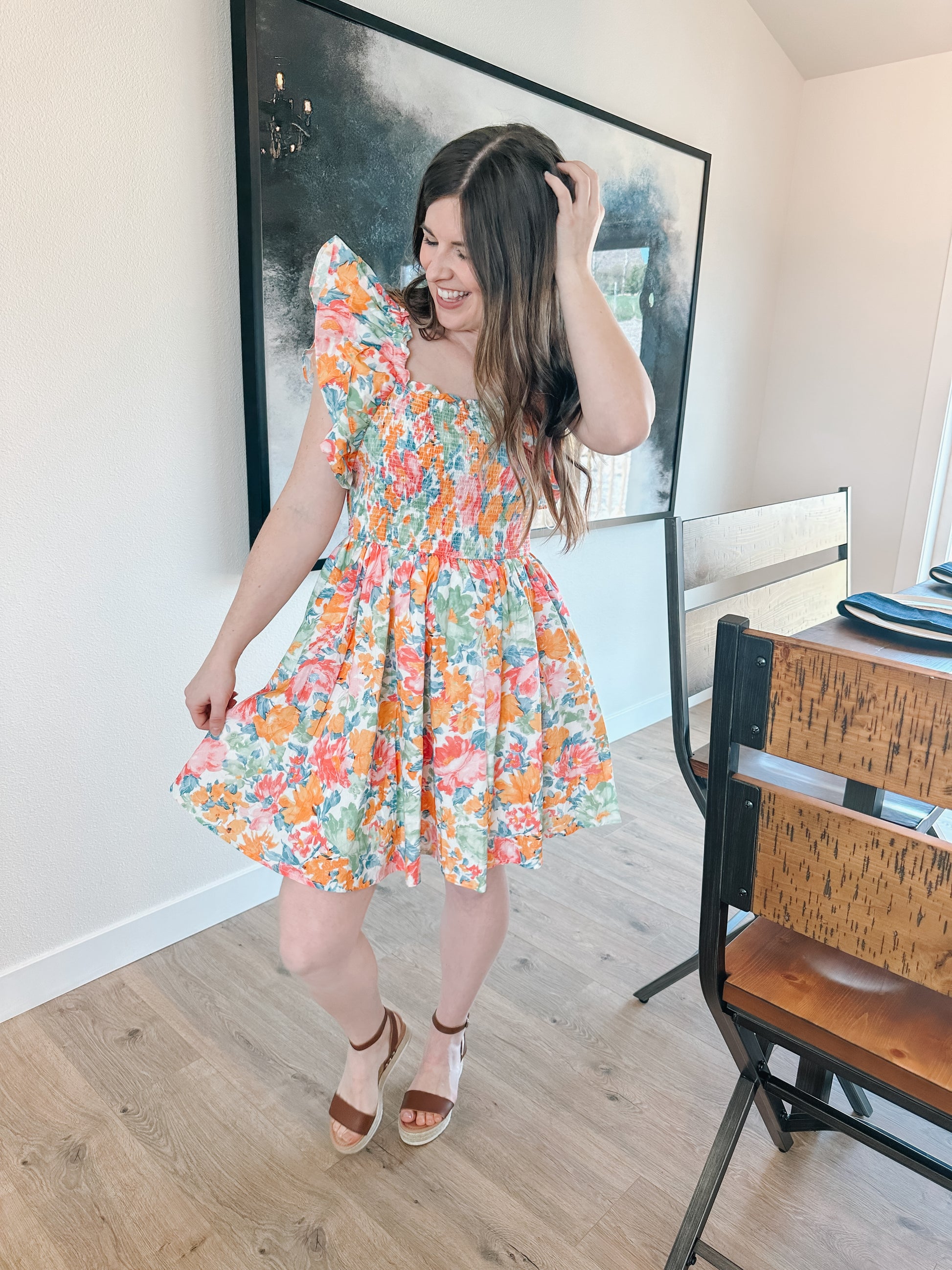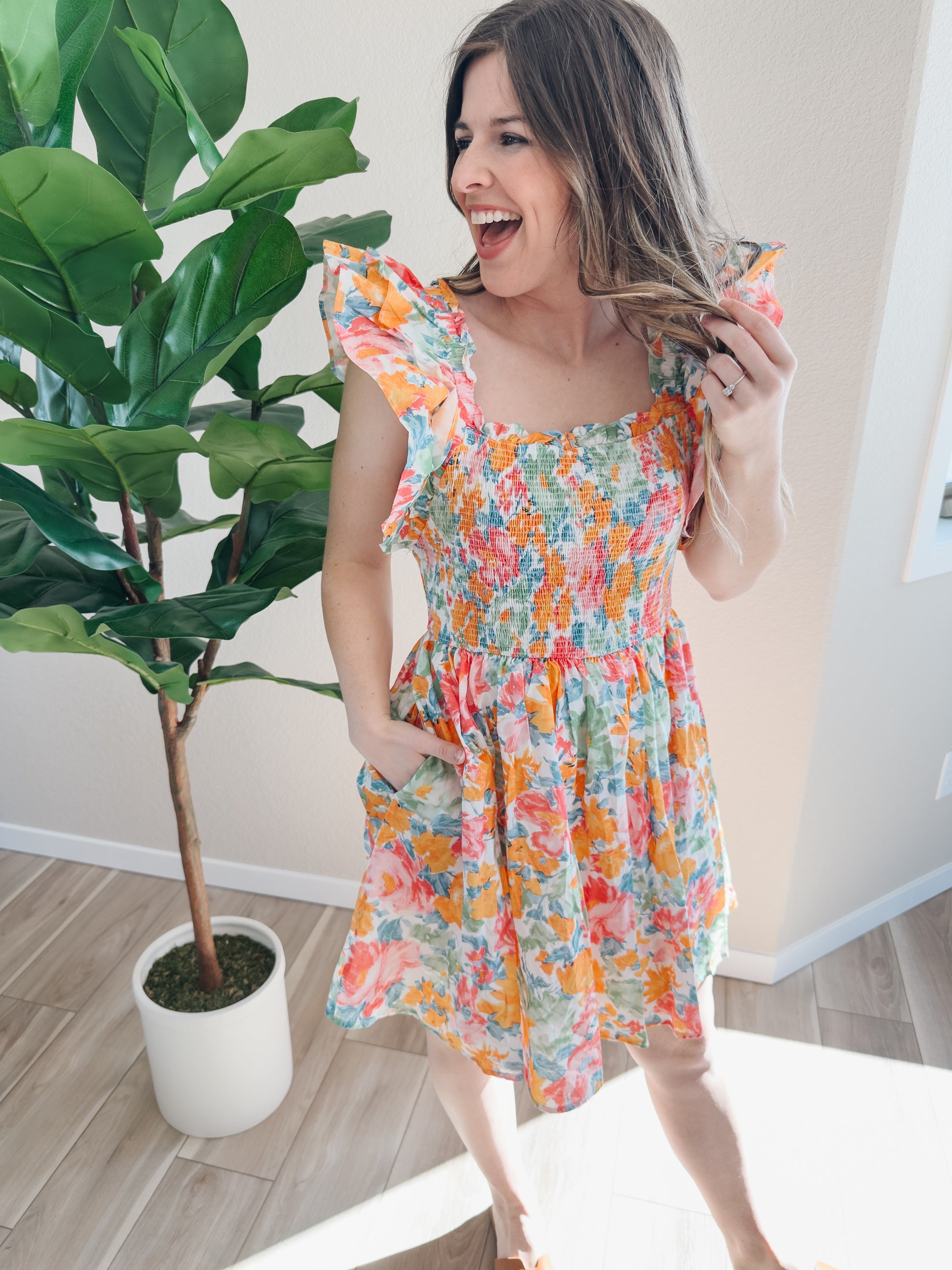 Introducing the "Wild One" Floral Mini Dress. Perfect for spring, this beautiful white dress is adorned with pops of orange, pink and teal floral print that will add a warm and sweet style to your wardrobe. The short flutter sleeves enhance the look of this piece while keeping you cool all summer. This gorgeous dress features pockets to keep all you things stored and keep you comfortable yet stylish. Perfectly lined throughout, this beautiful piece is perfect in every way!